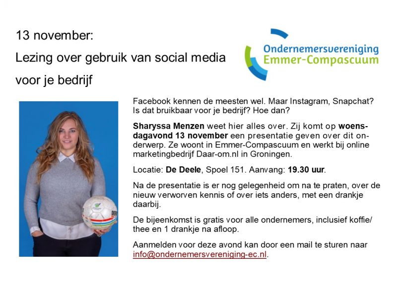 Sharyssa Menzen weet hier alles over. Zij komt op woensdagavond 13 november een presentatie geven over dit onderwerp. Ze woont in Emmer-Compascuum en werkt bij online marketingbedrijf Daar-om.nl in Groningen.