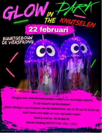Buurtvereniging De Viersprong organiseert op zaterdag 22 februari 2025 Glow in the Dark-knutselen voor kinderen van basisschoolleeftijd. De kinderen maken een verlichte kwal-paraplu.
