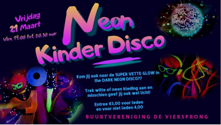 Buurtvereniging De Viersprong organiseert op vrijdag 21 maart 2025: Neon Kinderdisco.