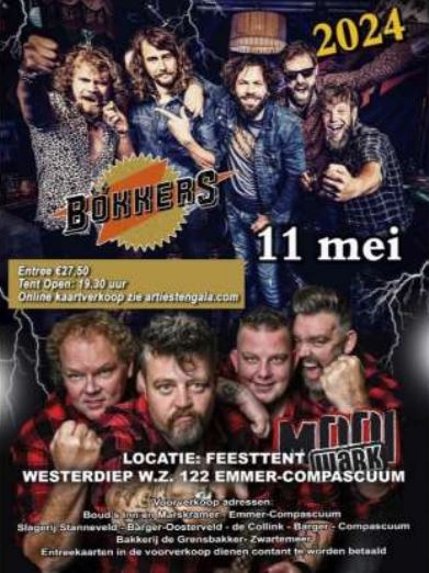 Op zaterdag 11 mei 2024 is er een optreden van Bökkers in de feesttent van Artiestengala, Westerdiep westzijde 122, Emmer-Compascuum.