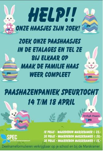Speurtocht voor kinderen. Zoek de haasjes in de etalages van de winkels in het centrum van het dorp.