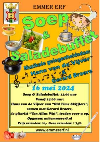 Op donderdag 16 mei organiseert buurtvereniging Emmer Erf in buurthuis De Stobbe een soep & saladebuffet met optreden van het muzikale gelegenheidsduo Hans van de Vijver en Gerard Broere.