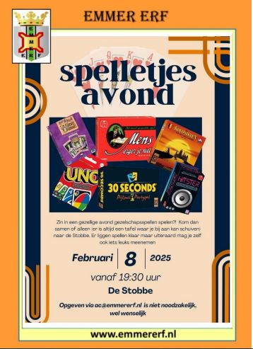 Emmer Erf organiseert op zaterdag 8 februari een spelletjesavond in buurthuis De Stobbe.