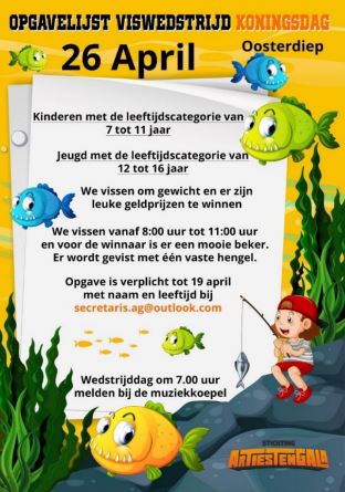 Op Koningsdag, zaterdag 26 april, kunnen de kinderen (7-11 jaar) en de jeugd (12-16 jaar) meedoen aan een viswedstrijd.