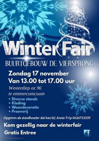 Op zondag 17 november organiseert buurtvereniging De Viersprong een winterfair. Locatie: Westerdiep oostzijde 96, Emmer-Compascuum.