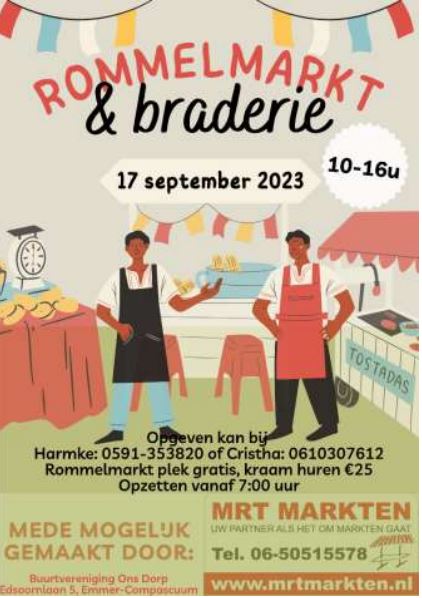 Op zondag 17 september is er rommelmarkt en braderie bij Buurthuis Ons Dorp, Esdoornlaan 5, Emmer-Compascuum.